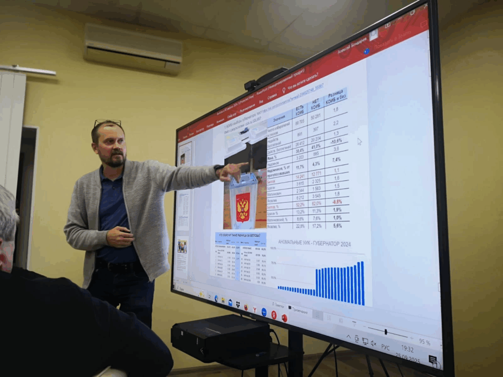 Гражданский активист Игорь Пирогов выступил с докладом о том, как различаются результаты на участках с КОИБ и без них. В продемонстрированной презентации тезис о наличии таких различий был подтвержден серьезной аналитикой и данными о результатах выборов 2024 года на Васильевском острове.