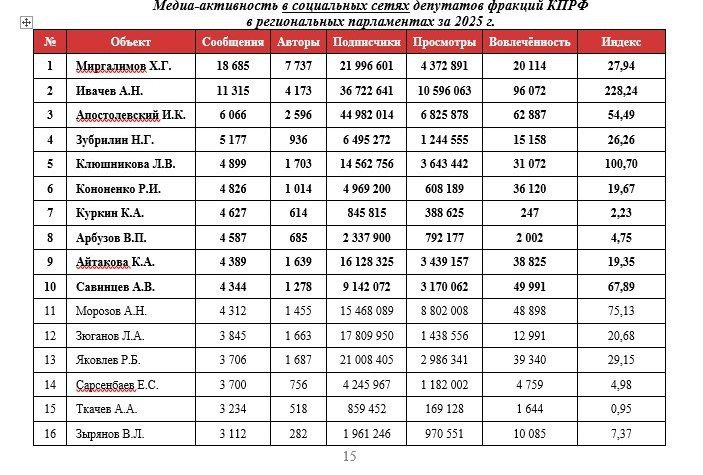 Отдел по проведению избирательных кампаний ЦК КПРФ, используя систему «Медиалогия» и данные «Крибрум.ПРО», проанализировал медийную активность депутатов от КПРФ во всех региональных парламентах страны. Исключением стала Республика Ингушетия, где КПРФ не представлена в законодательном органе региона. Результаты анализа были опубликованы в докладе «ЦИПКР. Итоги 2025. Медийные показатели депутатов региональных парламентов от КПРФ за 2025 год».