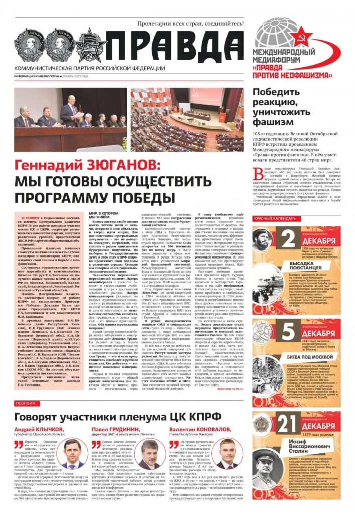 В декабрьском выпуске информационного бюллетеня ЦК КПРФ «Правда» опубликованы ключевые материалы II (ноябрьского) Пленума Центрального Комитета КПРФ.