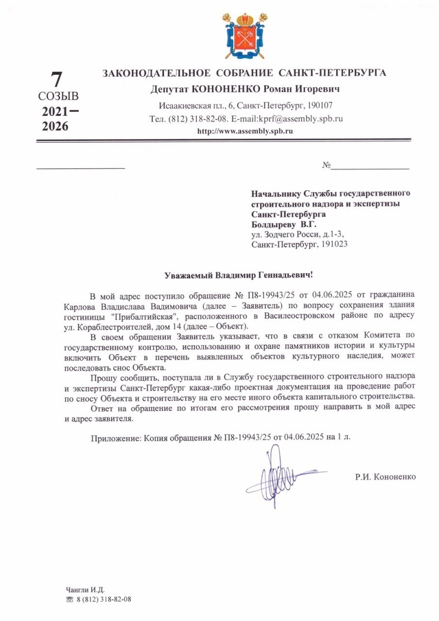 В ответ на запрос граждан Роман Игоревич подготовил запросы в Комитет по государственному контролю, использованию и охране памятников истории и культуры, а также в Службу государственного строительного надзора и экспертизы. В первом документе парламентарий призывает повторно рассмотреть возможность включения здания гостиницы в перечень выявленных объектов культурного наследия, а во втором – сообщить, поступала ли в Службу проектная документация на проведение работ по сносу здания.