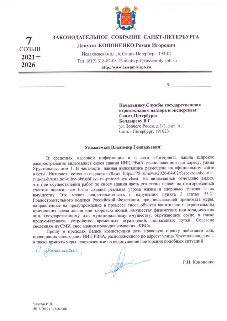 В начале апреля градозащитники снова забили тревогу — под угрозой оказалось здание НИИ ракетных войск и артиллерии на улице Хрустальной, которое начали сносить. Активисты при этом сообщили, что здание входит в перечень объектов, обладающих признаками культурного наследия. Издание «Мойка78» передало, что снос производит печально известная компания «Прайд» в интересах организации «КВС», намеревающейся построить здесь девятиэтажное здание. Скандал привлек внимание Следственного комитета. Но в итоге город фактически потерял очередное строение советского времени.